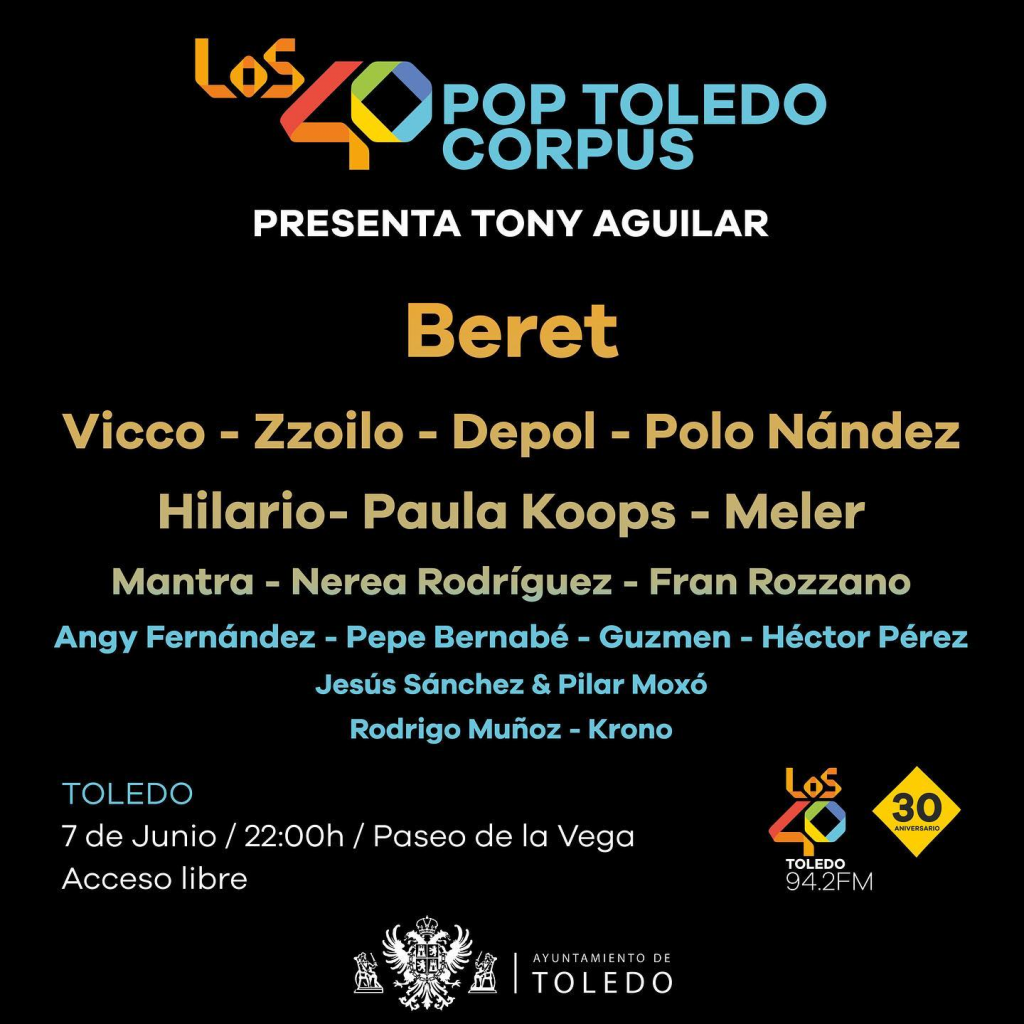 - Miércoles, 7 de junio 22:00 horas, en el Paseo de la Vega. Concierto “Los 40 Pop“, presentado por Tony Aguilar, con las actuaciones de Beret como cabeza de cartel, Z-zoilo, Depol, Polo Nández, Hilario, Paula Koops, Meler, Mantra, Nerea Rodríguez, Fran Rozzano, Angy Fernández y los artistas toledanos Jesús Sánchez y Pilar Moxó, Rodrigo Muñoz Band y Krono. Acceso libre.