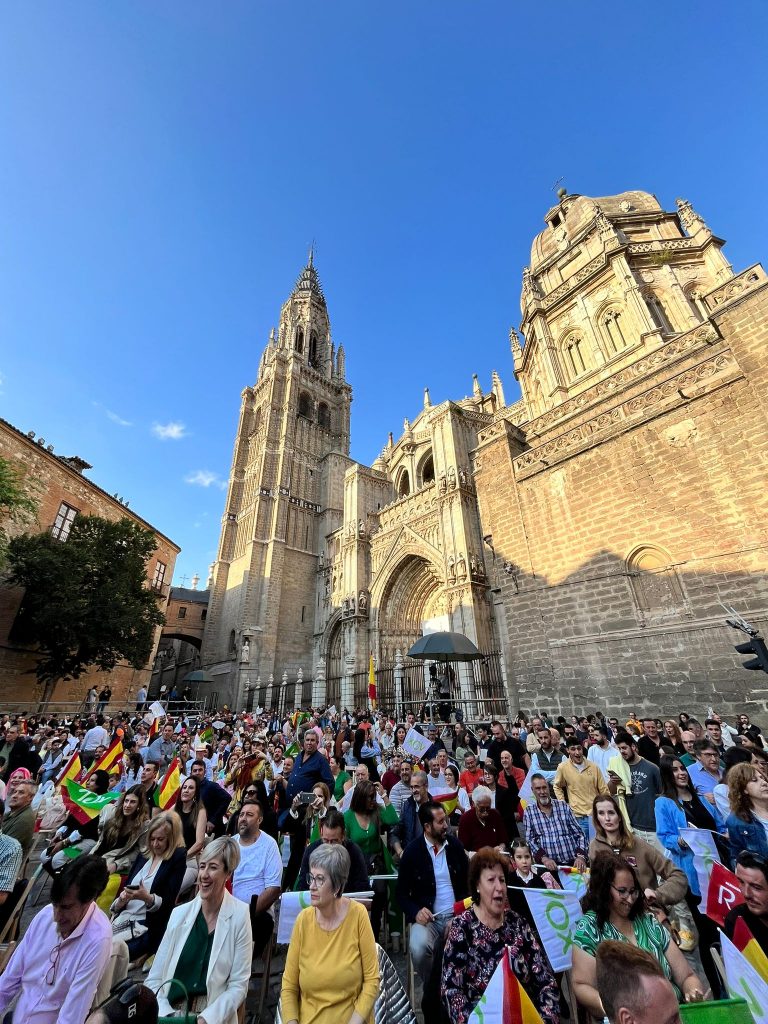 El líder de VOX, Santiago Abascal, se da un baño de masas en Toledo, en la misma plaza del ayutamiento donde luchan por conseguir un gran resultado este domingo tras el cierre de votaciones.